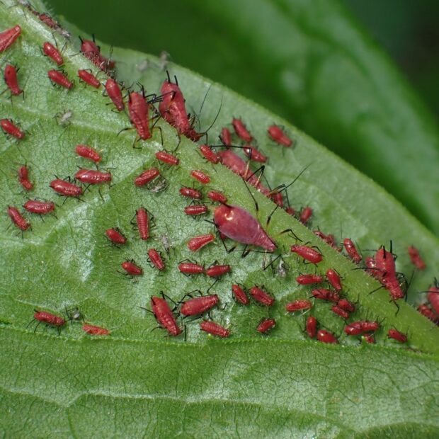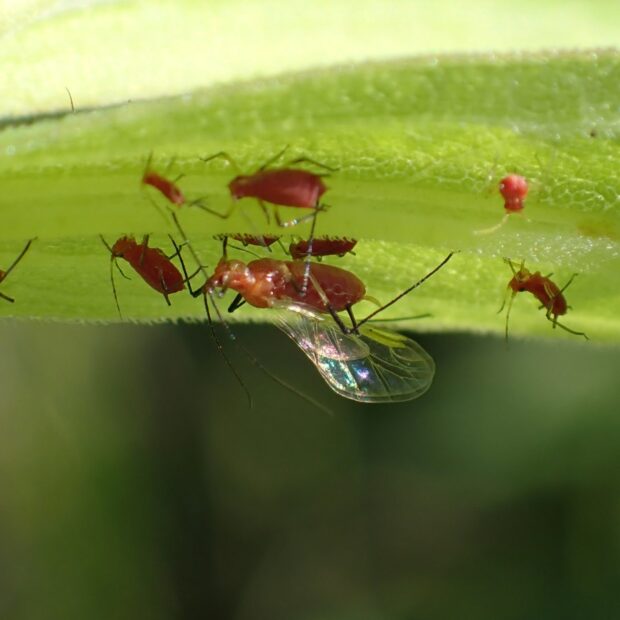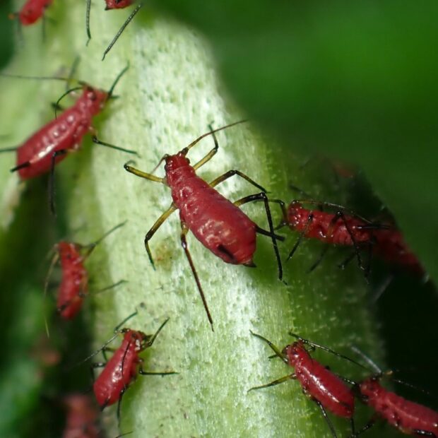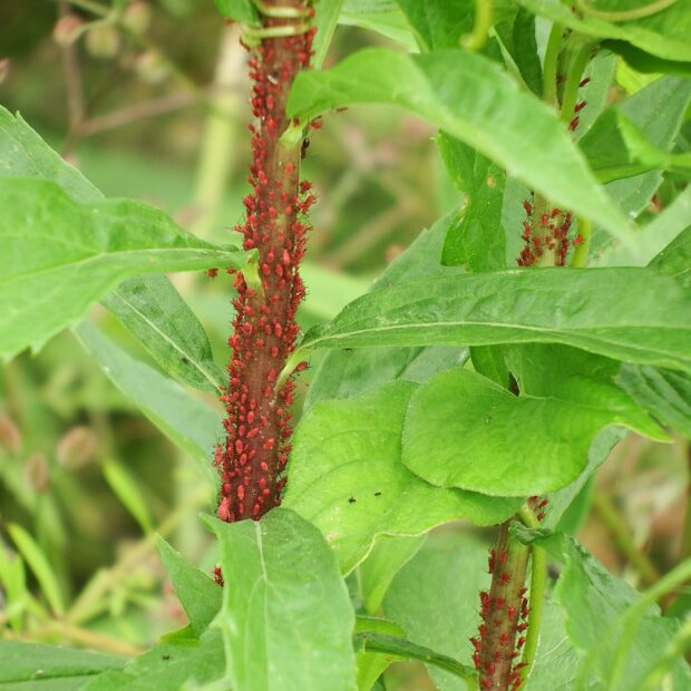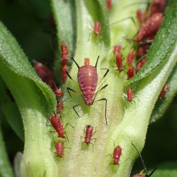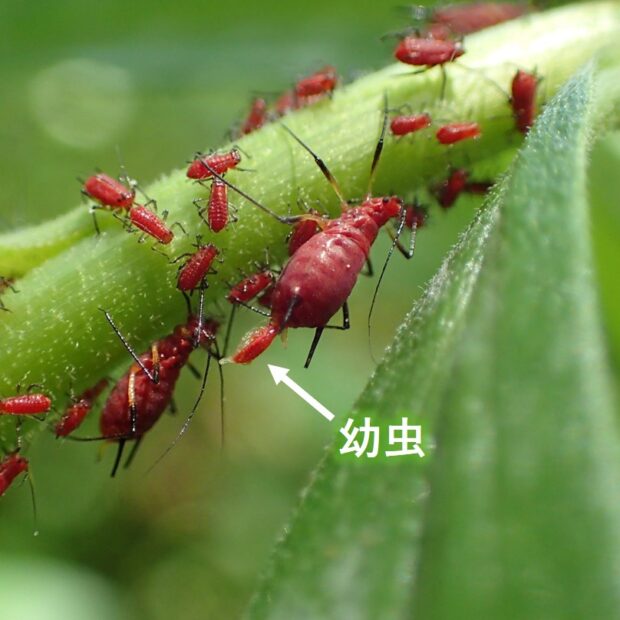 セイタカアワダチソウの茎や葉に集団でつく赤いアブラムシ。 1991年に日本で確認された北アメリカ原産の外来種。