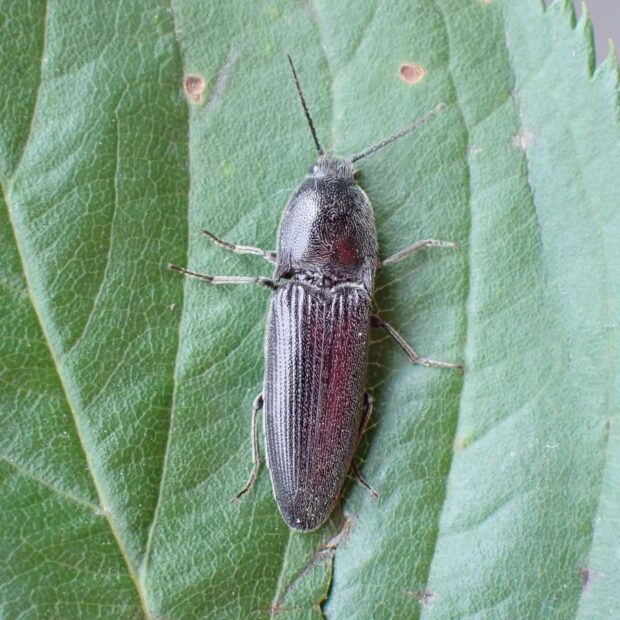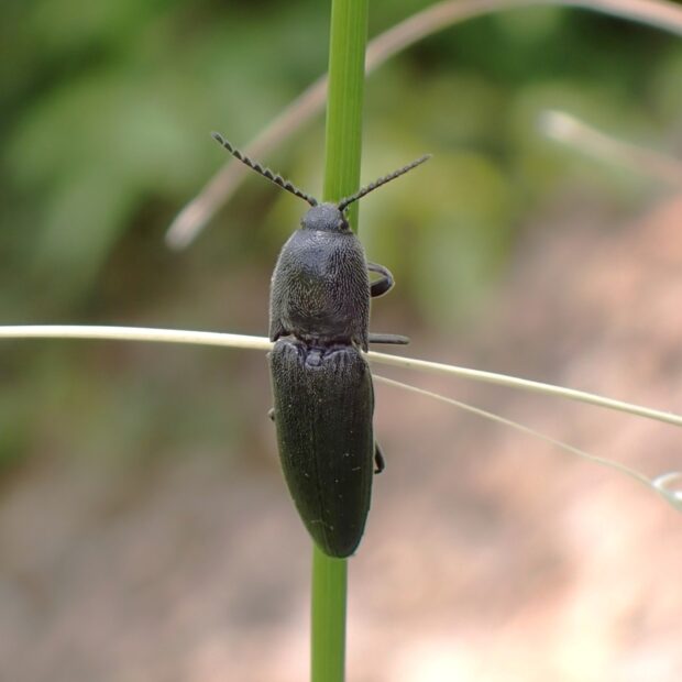 コメツキムシの仲間。 黒い体全体に灰白色の毛が生えています。 市街地でも普通に見られます。 似ている種が多く、 同定には注意が必要。