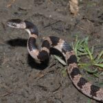 成蛇も幼蛇も尾から後頭部まで、 灰褐色に黒の斑模様が入ります。