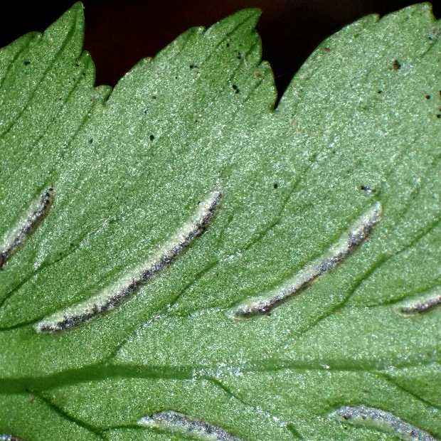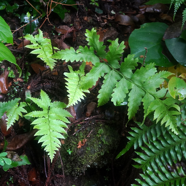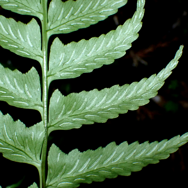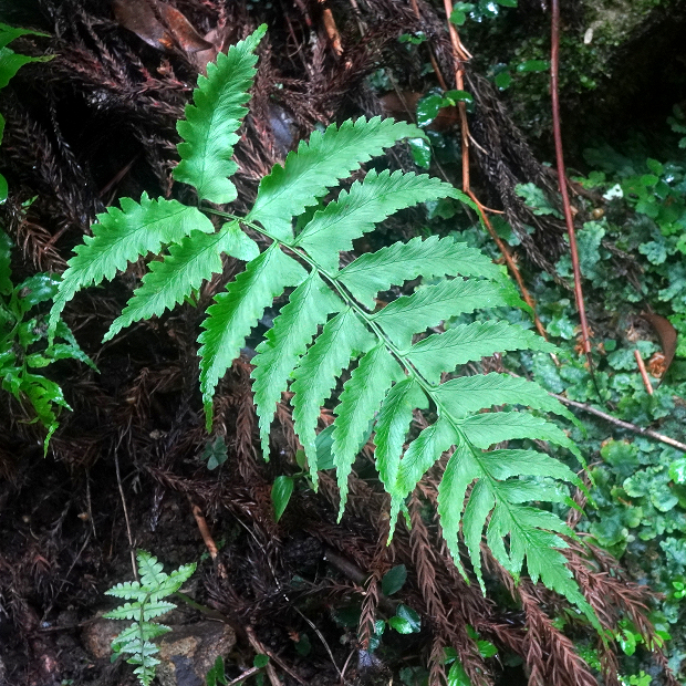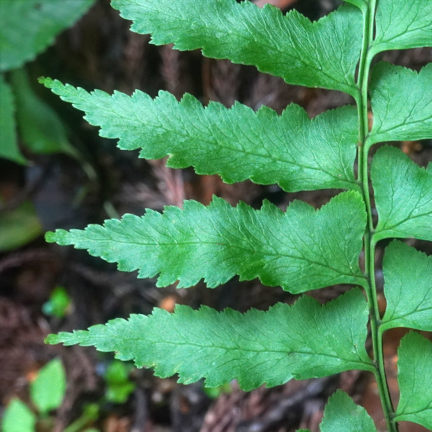 暖かい地域に生えるノコギリシダに近縁のシダ。 本種の方がずっと希少で、 冬に地上部を枯らす夏緑性なので、 質はより薄くペラペラしています。 また、 羽片の数はより少なく、 葉裏につく胞子のう群はより長く、 根茎が短めでまとまって葉を出します。 両者で雑種をよく作ります。 名前は愛媛県の旧国名である伊予と、 葉を広げる姿がクジャクの羽に似ていることが由来です。