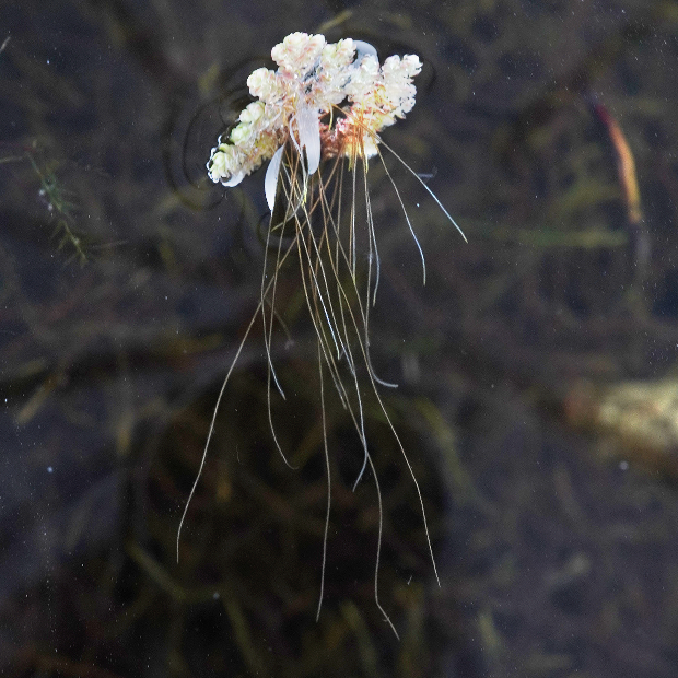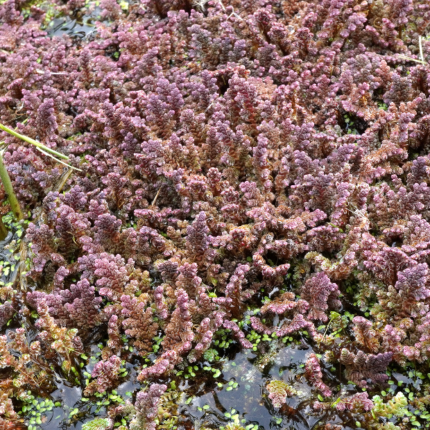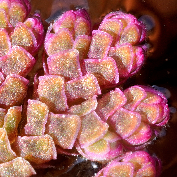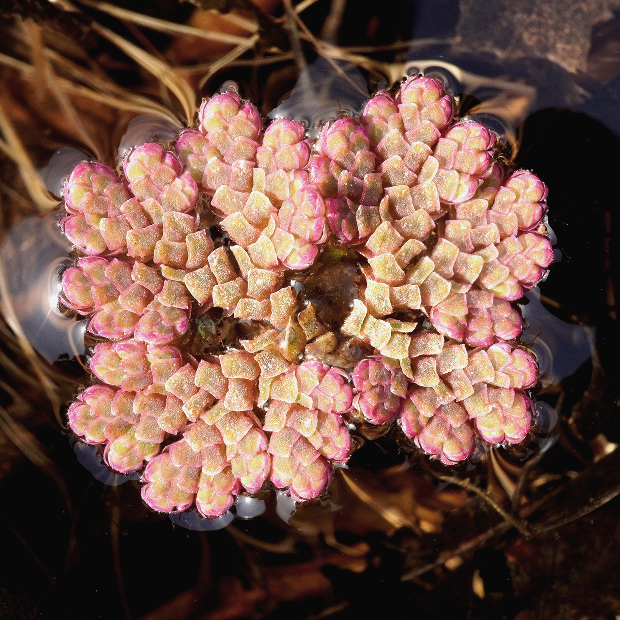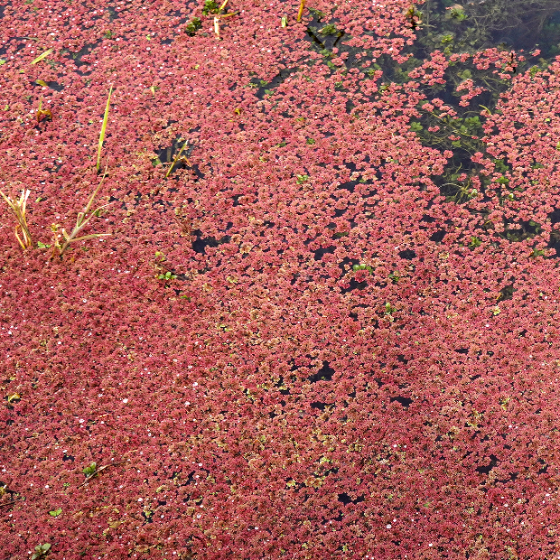 自然豊かな水辺に浮かぶ水生シダ。 植物体は不規則なアメーバ状の形をしていて、 ウロコみたいな葉に覆われます。 冬が近づくと、 鮮やかなピンク色に紅葉してきれいです。 初夏頃、 まれに茎の下に胞子のう果をつけます。 近年猛威を振るっている外来種のアカウキクサ属(外来アゾラ)とは、 葉がより大きくて表面の突起が小さめで、 水中に伸びる根につく根毛が早く抜けてしまうことなどで異なりますが、 区別が難しいです。 もう1つの在来種であるアカウキクサは、 植物体が三角形なので簡単に区別できます。