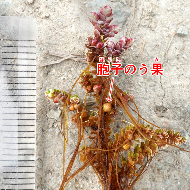 論文でも示されている、 DNA以外では最も信頼できる特徴。 胞子のう果にできる球状体(マスラ)につく錨状の突起をグロキディウムといいます。 このグロキディウム内部にある仕切り(隔壁)の本数と位置が種類によって違い、 但馬型は先端近くに3本以上できます。 対してニシノオオアカウキクサでは隔壁がないか、 まれに先端近くに1~2本しか見られません。 アメリカオオアカウキクサは全体に多数の隔壁をもつ傾向があります。 この識別法の最大の問題点は、 オオアカウキクサ類が胞子のう果をあまり作らず、 観察が難しいところにあります。