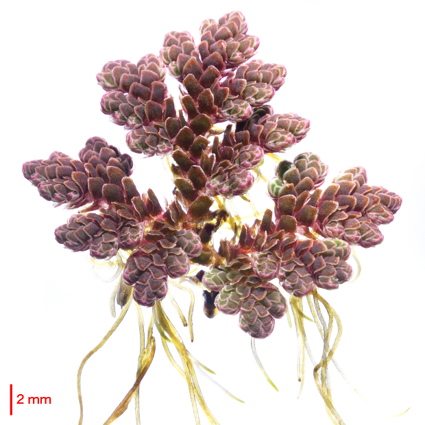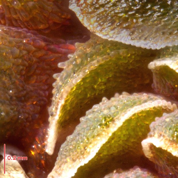 調べるのに顕微鏡が必要な特徴。 但馬型の突起は1細胞で小さめ。 一方、 外来アゾラは表面のツブツブが目立つことが多く、 特に2細胞からなる突起があれば外来アゾラと判断できます。 ただし、 外来アゾラでも突起が目立たないことがあり、 これだけで但馬型とすることはできません。