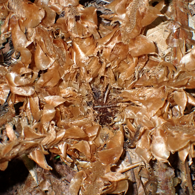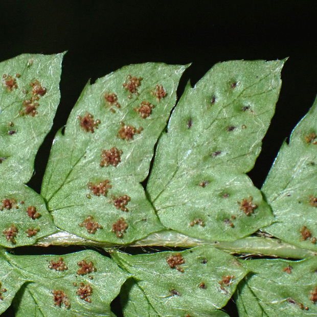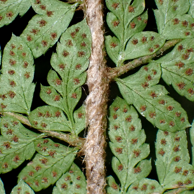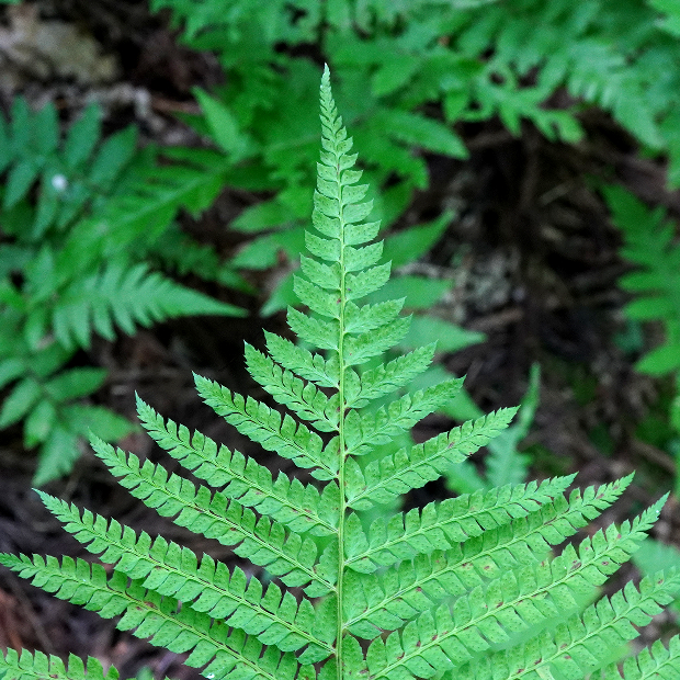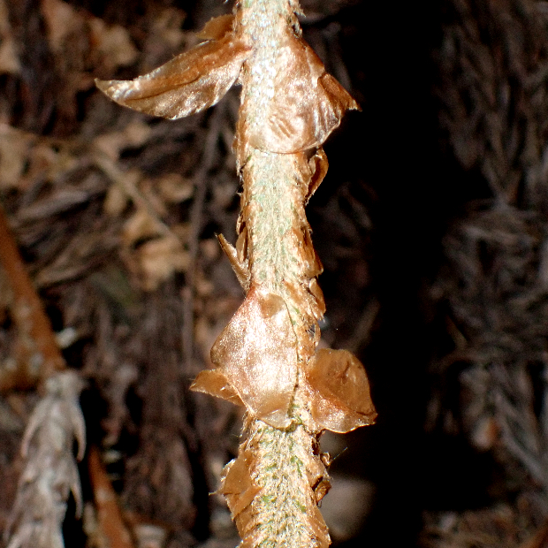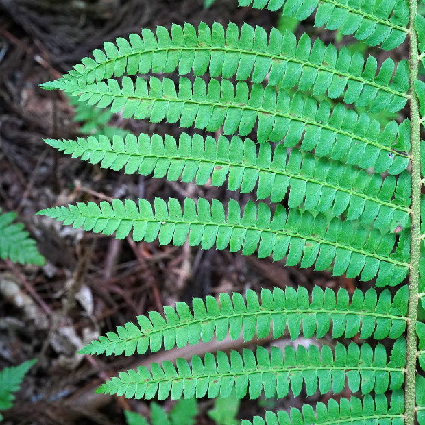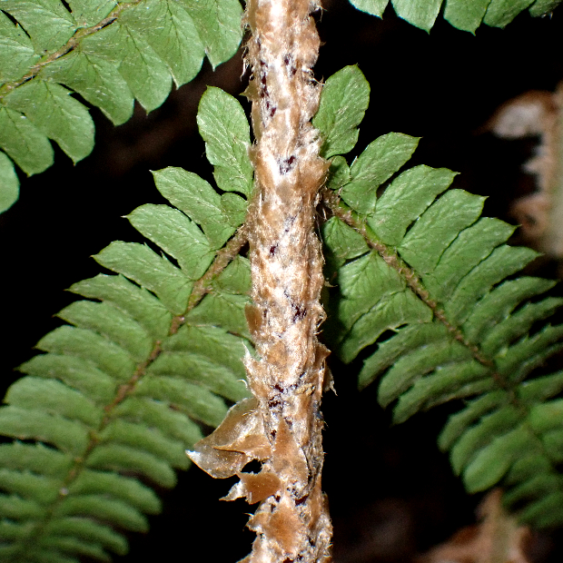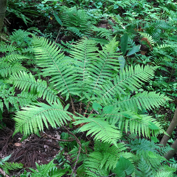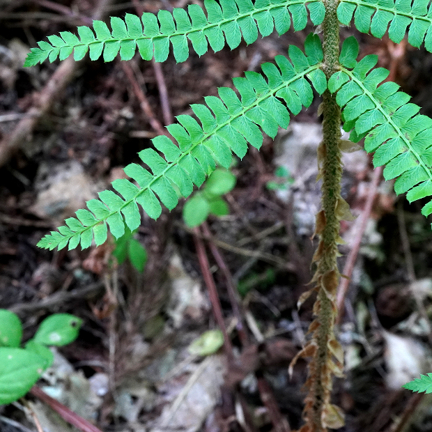 日本海側の林内に多いイノデ類のシダ。 ツヤのない黄緑色の大きな葉を、 放射状に多数広げます。 一番の特徴は、 葉軸に下向きに圧着してつく鱗片で、 名前の由来にもなっています。