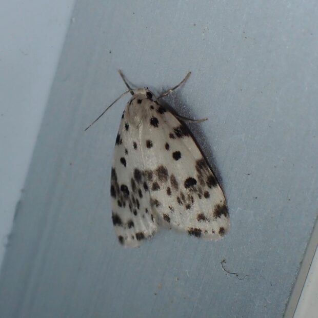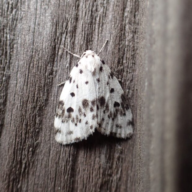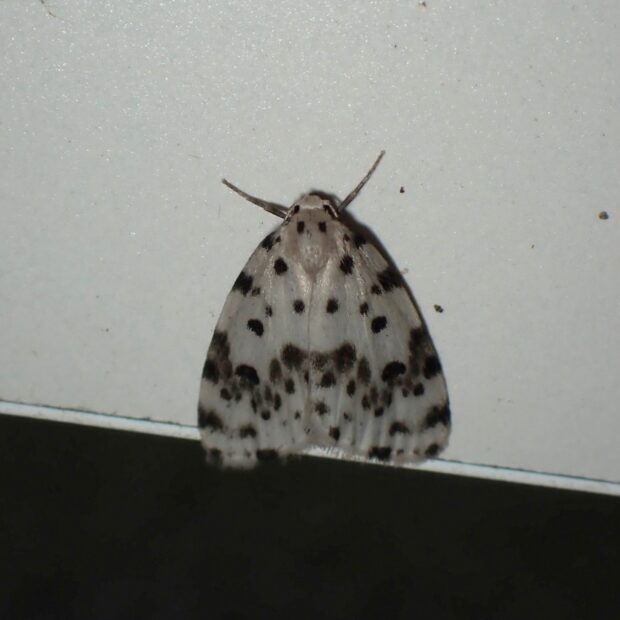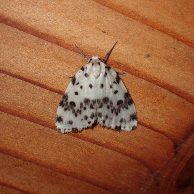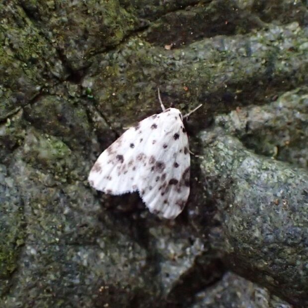 ヒトリガ科コケガの仲間。 白いはねに黒い紋が散らばるコケガ。 ホシオビコケガはクシヒゲホシオビコケガとクシナシホシオビコケガの2種に分けられました。