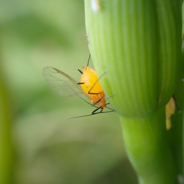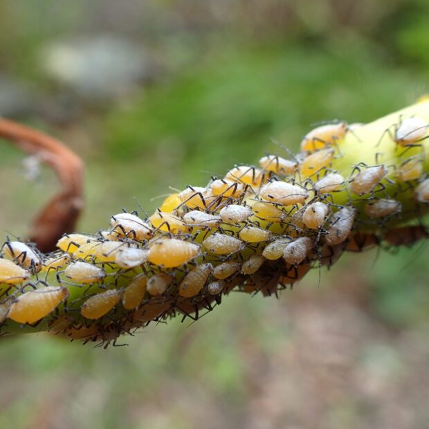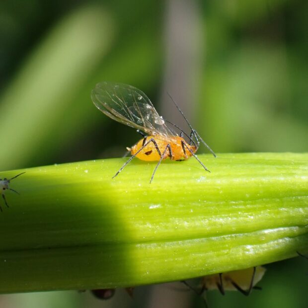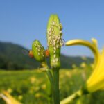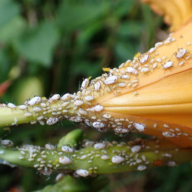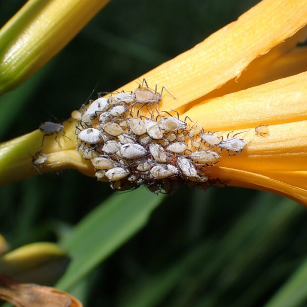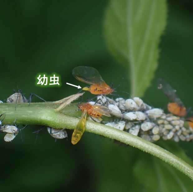 白い粉におおわれた大型のアブラムシ。 夏はワスレグサ類(カンゾウ、 キスゲなど)で過ごし、 秋にミツバウツギやゴンズイに移動します。 卵越冬。