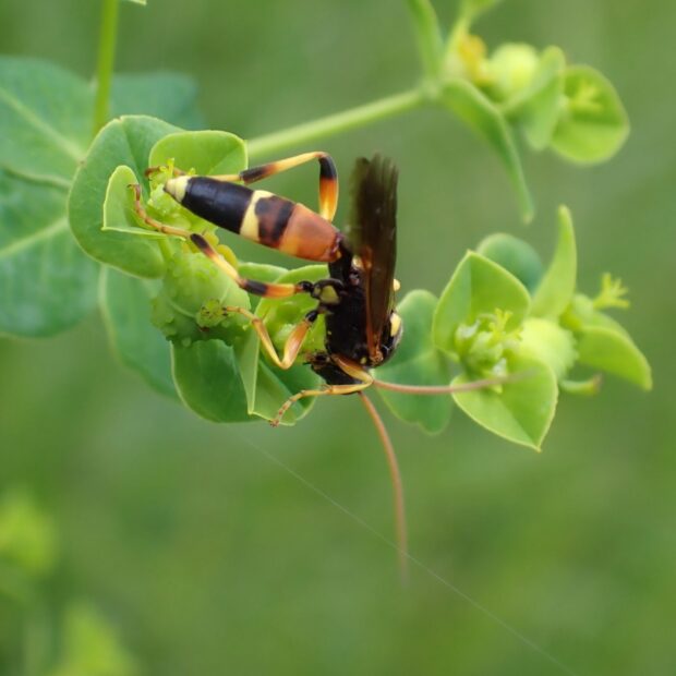 ヒメバチ科の仲間。 アゲハの幼虫に卵を産む寄生バチ。 体やあしはカラフルな色合いで美しいハチ。 草地の花にやって来ます。