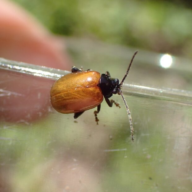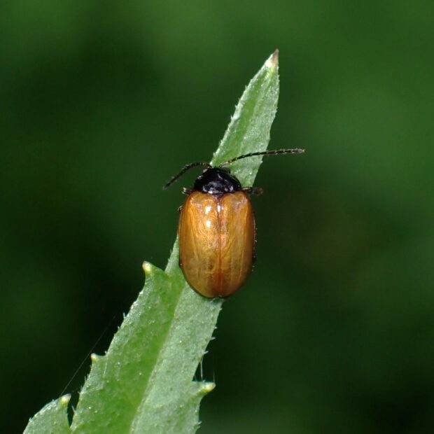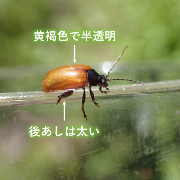 ハムシ科ノミハムシの仲間。 上翅は黄褐色でツヤがあり、 頭部、 胸部、 触角、 あしは黒色です。 後あし腿節(たいせつ)が太く、 危険を感じると跳んで逃げます。