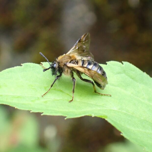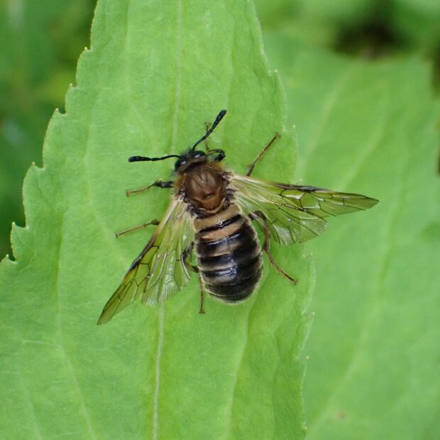 コンボウハバチの仲間。 触角は先が太いこん棒状で、 オスは金属光沢のある紺色、 メスは金銅色をしているものが多いです。