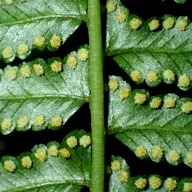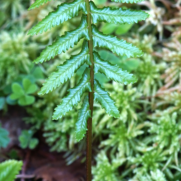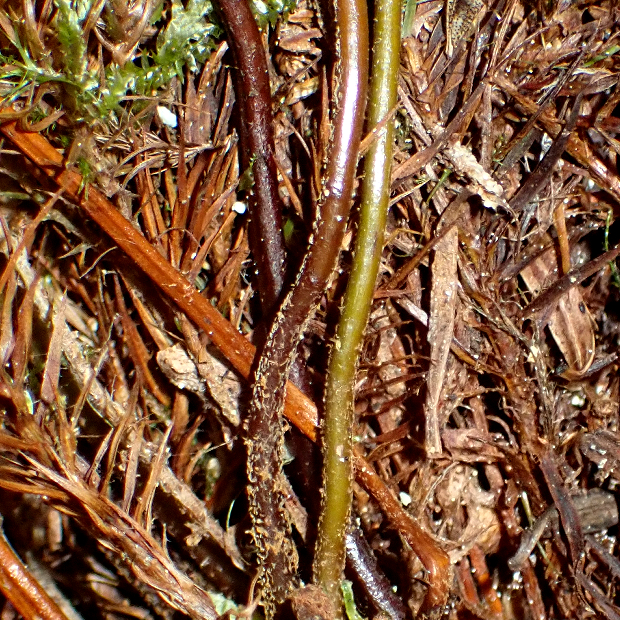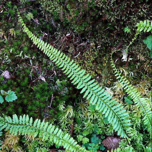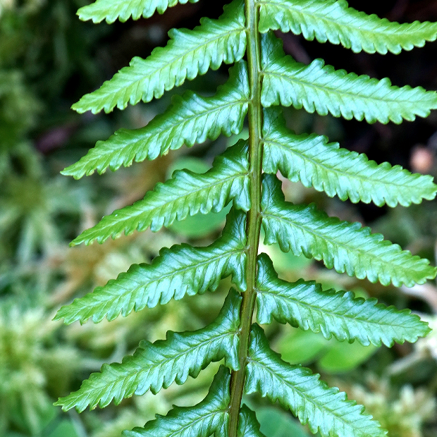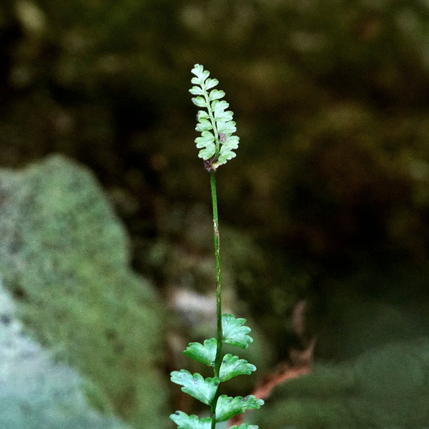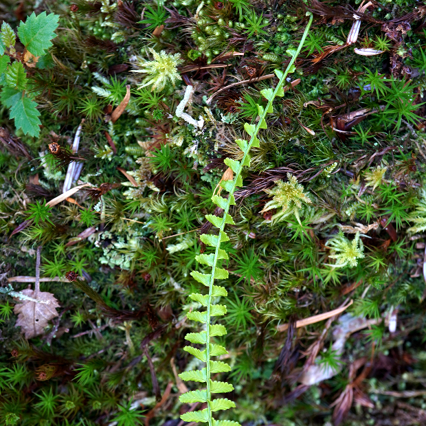 暖かい地域の山地に生える細長めのシダ。 大きな特徴は、 葉先が細く伸びて先に無性芽をつけることで、 クローン集団が群生していることがよくあります。 葉は濃緑色でツヤがあり、 葉裏につく胞子のう群は円形で包膜がなく、 葉柄基部には毛をつけます。