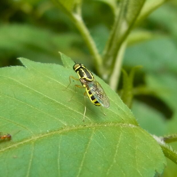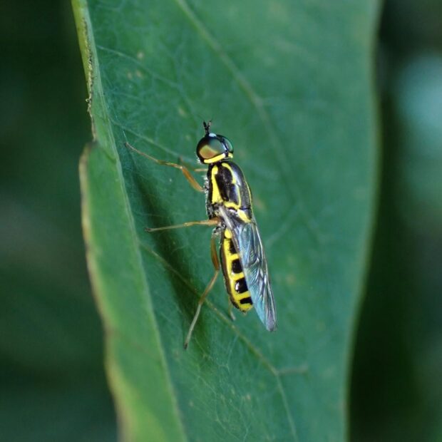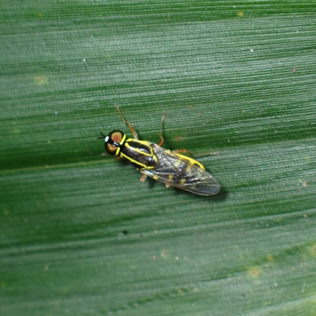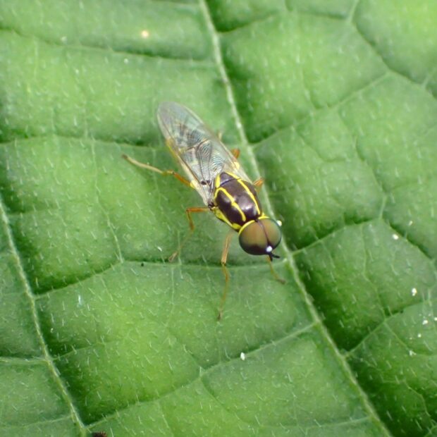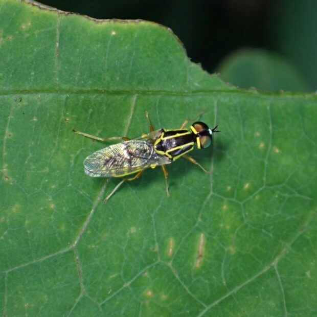 黄色いラインがある小さなミズアブ。 複眼後縁、 前胸背板(ぜんきょうはいばん)、 小楯板(しょうじゅんばん)、 腹部の背中に黄色い線があります。 葉の上で活発に動き回ります。