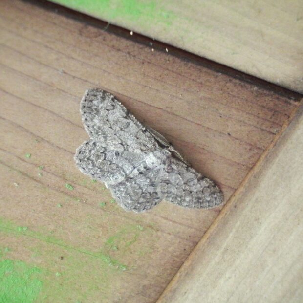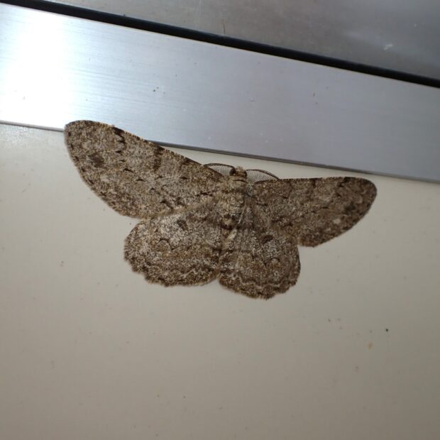 エダシャクの仲間。 似ている種がいますが、 本種は後ばねの紋が白抜きになっています。 明かりに飛来。