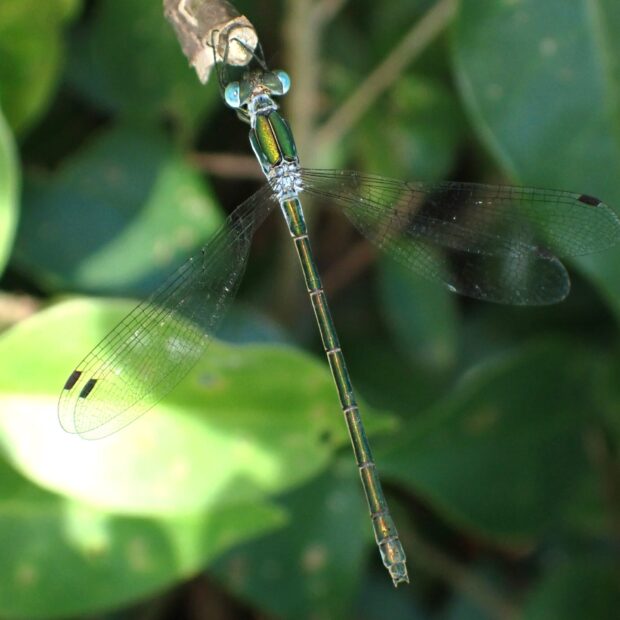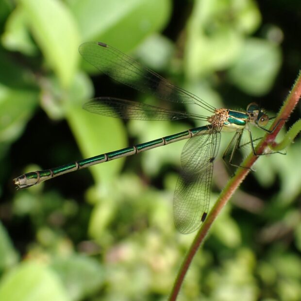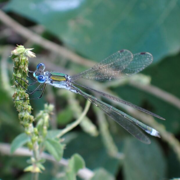 白い粉を帯びる緑色のトンボ
