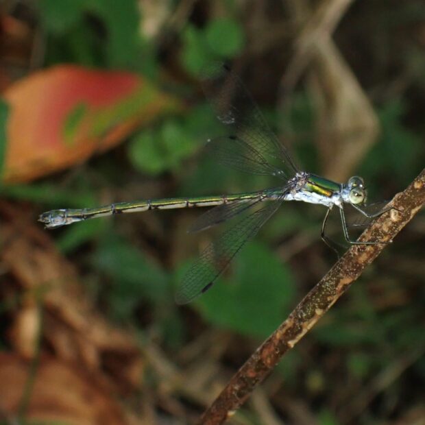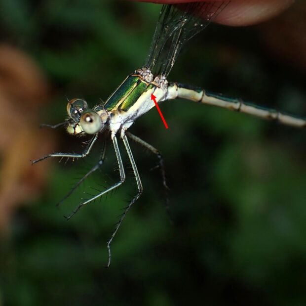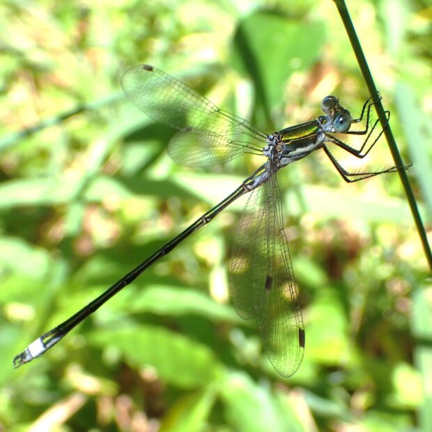 オオアオイトトンボは成熟しても白い粉をおびませんが、 本種のオスと一部のメスは白い粉をおびます。