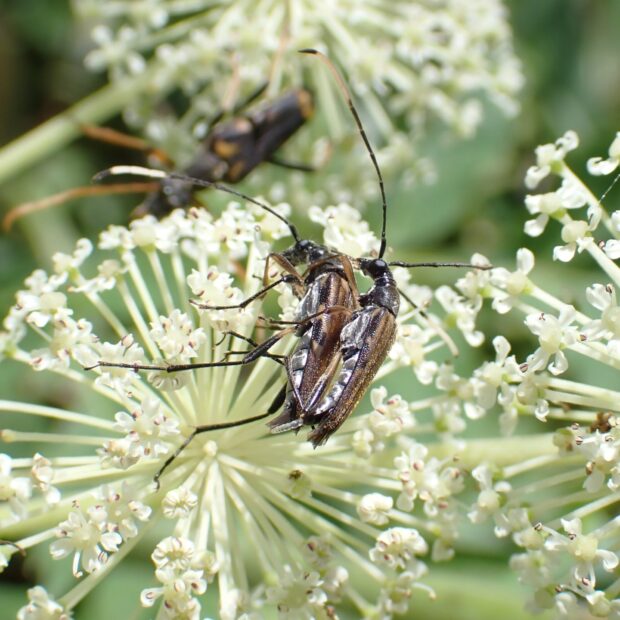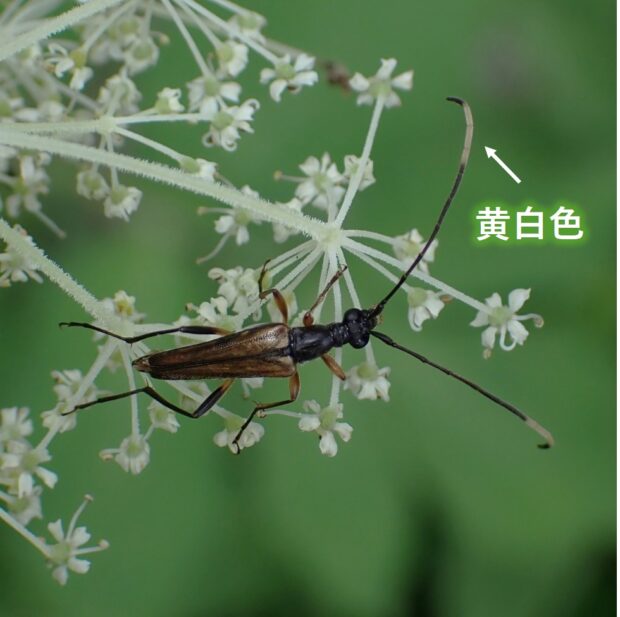 花に集まるハナカミキリの仲間。 丘陵地~山で普通に見られます。 体は細長く、 黒い触角の先端付近の黄白色が特徴的。 ニンフはギリシャ神話に出てくる妖精の意味。 タテジマホソハナカミキリに似ていますが、 本種の方が体が長く、 触角の黄白色の部分に違いが見られます。