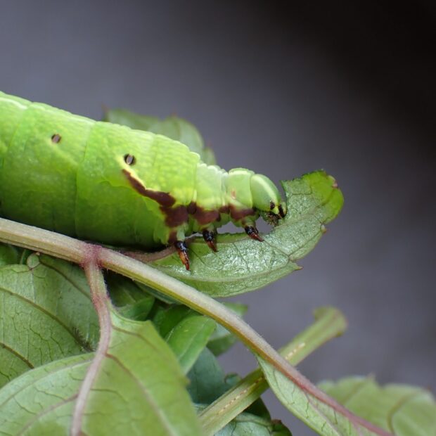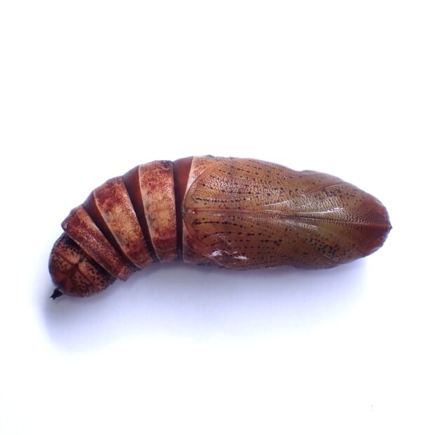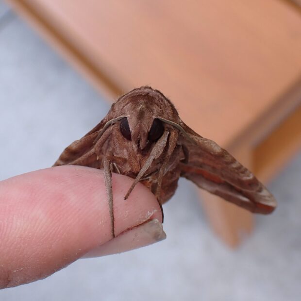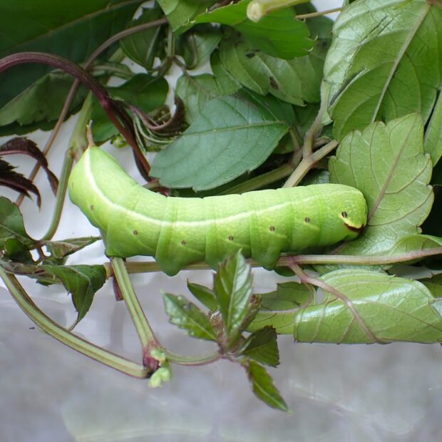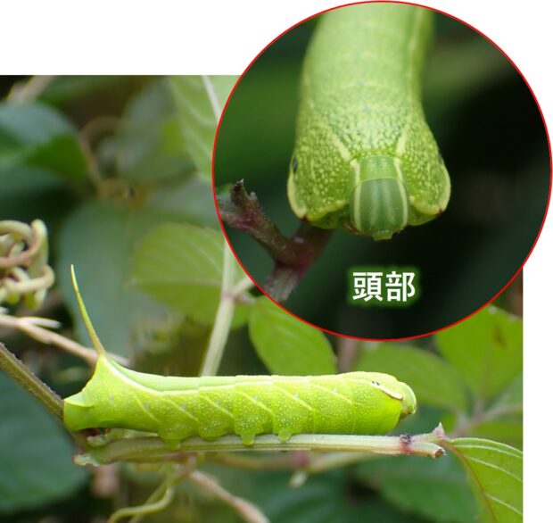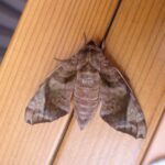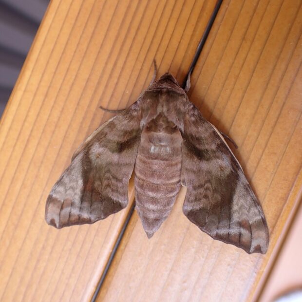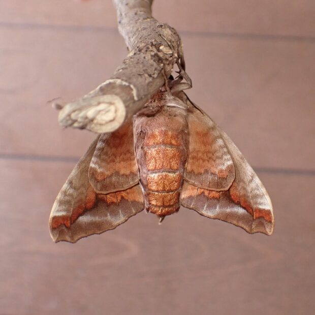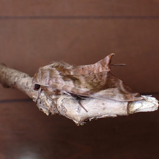 スズメガの仲間。 茶色のはねは、 地味ながら美しく、 ビロードのような質感があります。 幼虫はブドウ科植物を食べます。