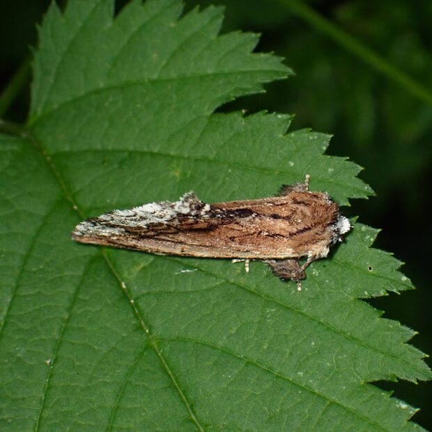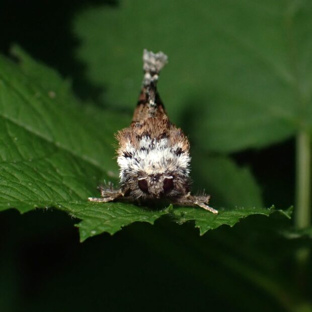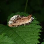 山で見られるシャチホコガ科の仲間。 前ばねの外縁の白い帯が特徴的。 このことから「シロオビ」と名づけられました。 茶色いはねの色合いから木のかけらのように見えます。 明かりに飛来。