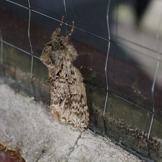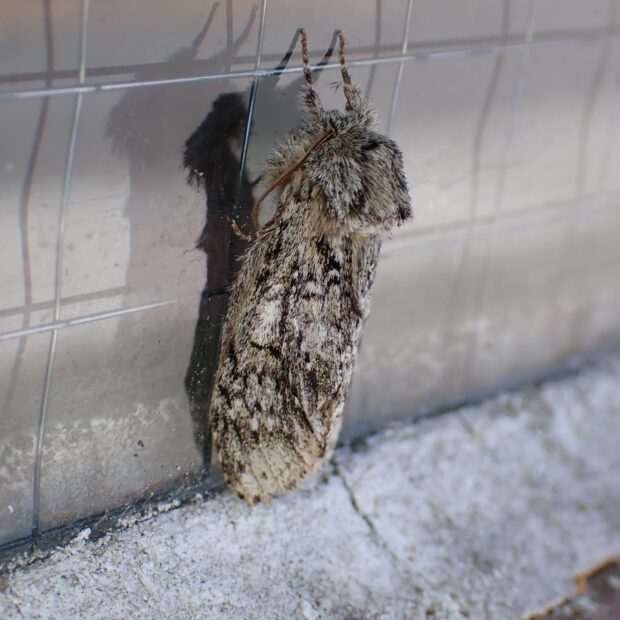 シャチホコガ科の仲間。 はねは黒色の線がある灰白色で、 体はフサフサの毛でおおわれています。 ウグイスシャチホコに似ています。 明かりに飛来。