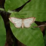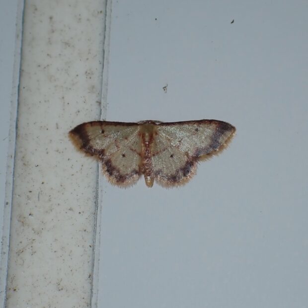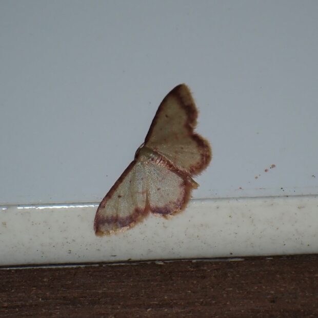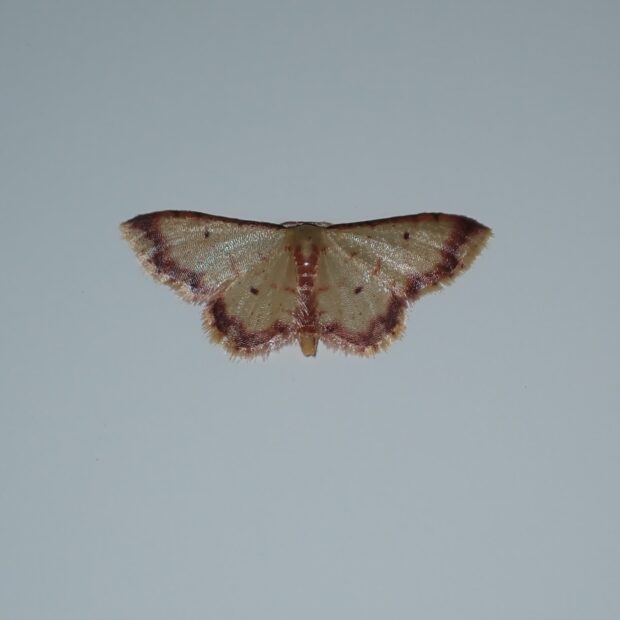 シャクガ科ヒメシャクの仲間。 小型。 淡い黄色のはねの縁に紅色の帯があります。 昼間は林縁の草木の葉の上で見られ、 夜は明かりにやって来ます。