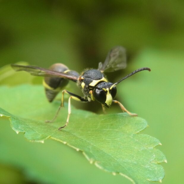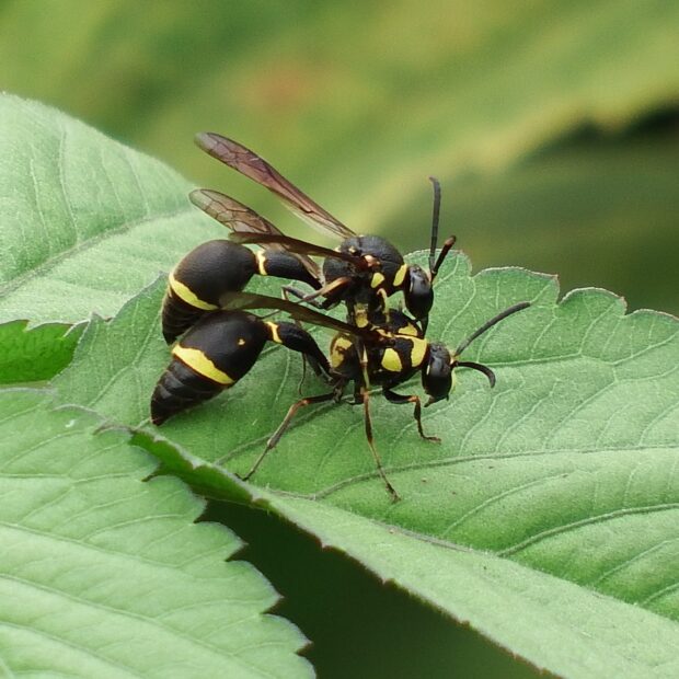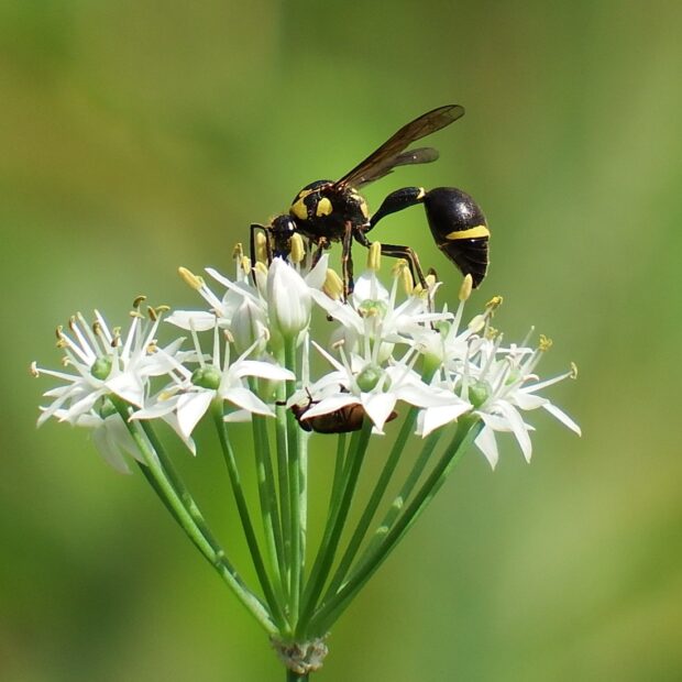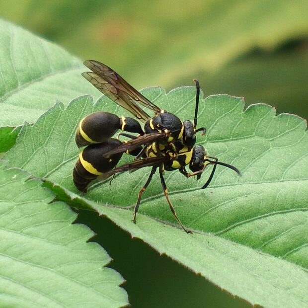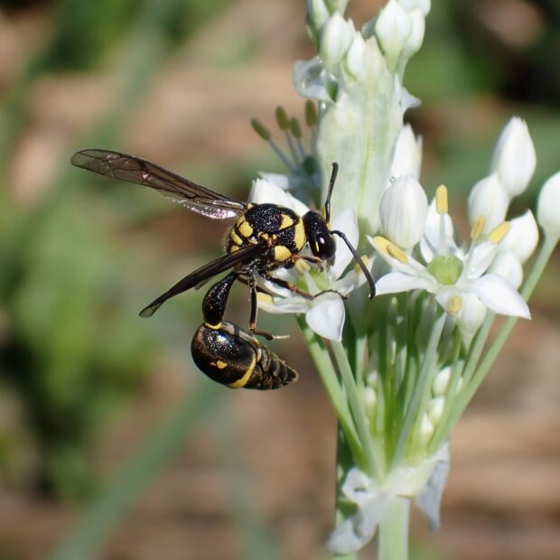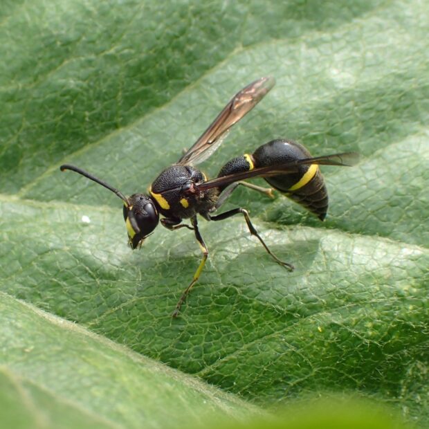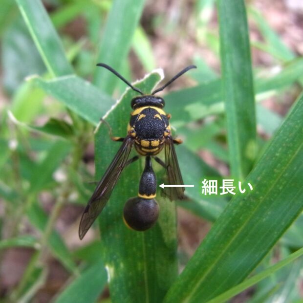 ドロバチ科の仲間。 別名トックリバチ。 壁などに、 泥を使ってトックリ型の巣を作ります。 巣の中には幼虫のエサとなる麻酔のかかったガの幼虫が入っています。