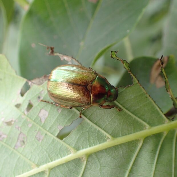 サクラ類などで見られるコガネムシ。 体はツヤがあり、 上翅(じょうし)は緑銅色~黄褐色で、 変化に富みます。 ツヤコガネに似ています。