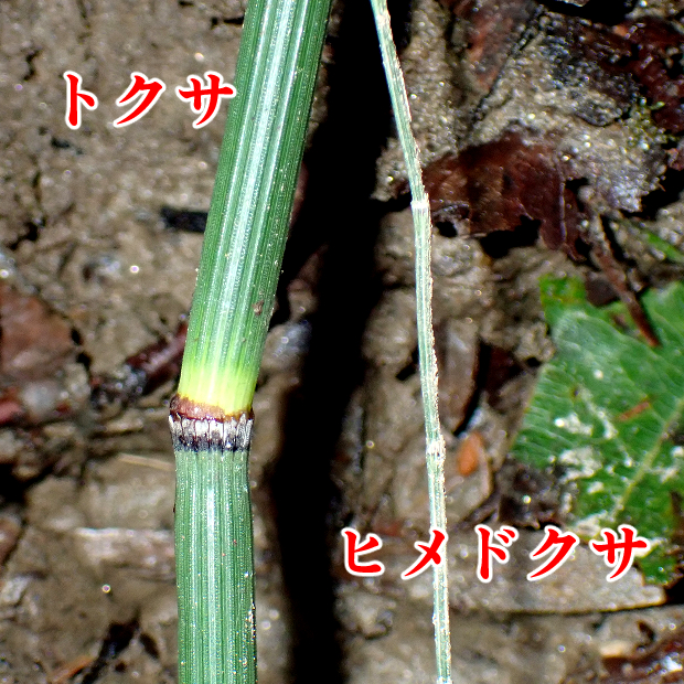 日本では北海道にのみ分布するシダ。 トクサに近縁で、 地上茎先に胞子のう穂をつけるところは同じですが、 茎がそれよりはるかに細くてひょろひょろしています。 より似ているチシマヒメドクサとは、 茎がより細めなことや、 葉鞘の葉片が5個以下であること、 茎の横断面中心が詰まっていることなどで区別できます。