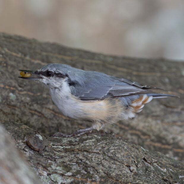 繁殖期以外の時期は、 シジュウカラやエナガなどの混群内で見られることが多く、 群れの中に数羽の本種がいるところを観察できます。
