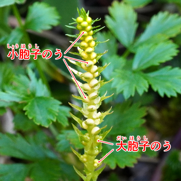 北半球の寒い地域に広く分布するシダ植物で、 日本では高山でまれに見られます。 明るい草地の中から細い茎を立ち上げ、 丸い胞子のうを多くつけます。 その外見はヒカゲノカズラっぽさがありますが、 大小2種類の胞子をつくるなどの特徴から、 イワヒバに近縁とされます。