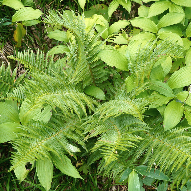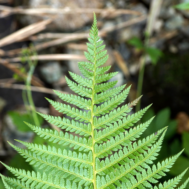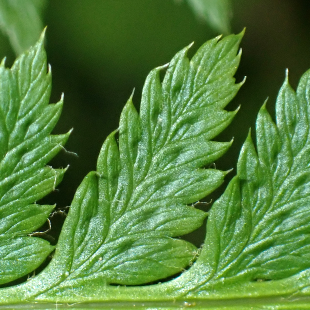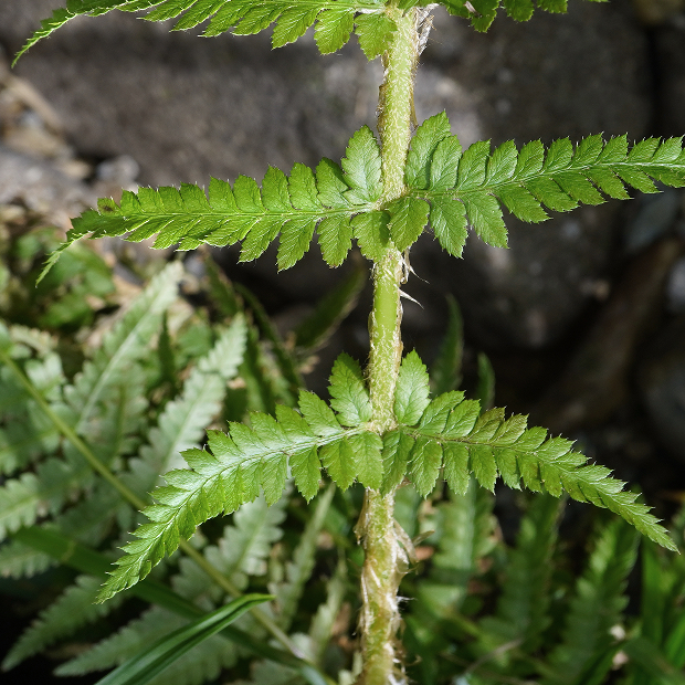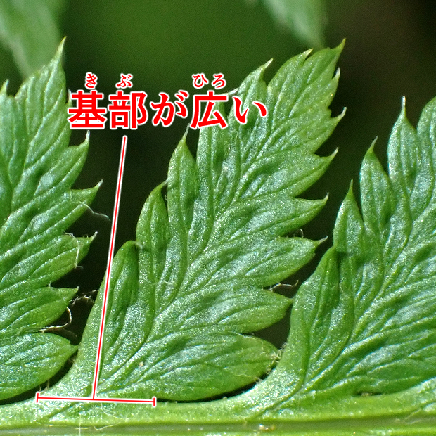 小羽片基部は柄にならず、 軸に3mm以上広くつく。