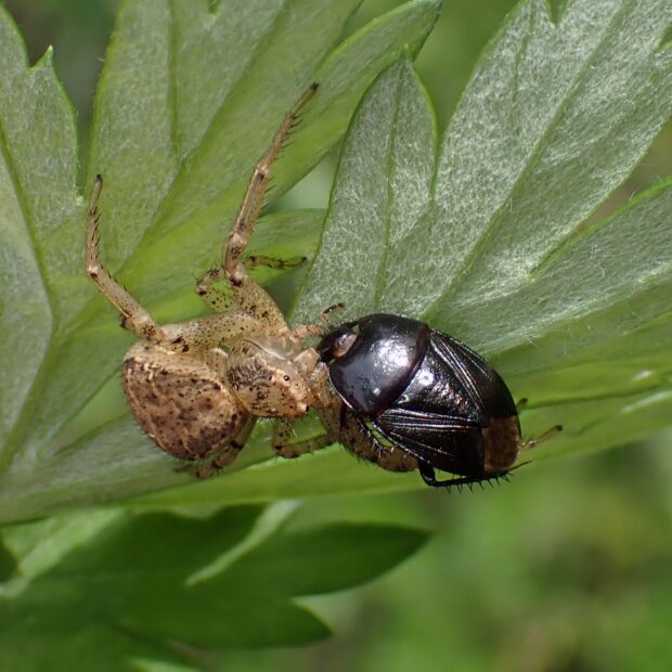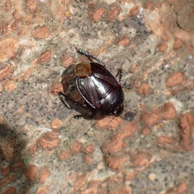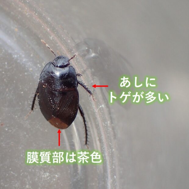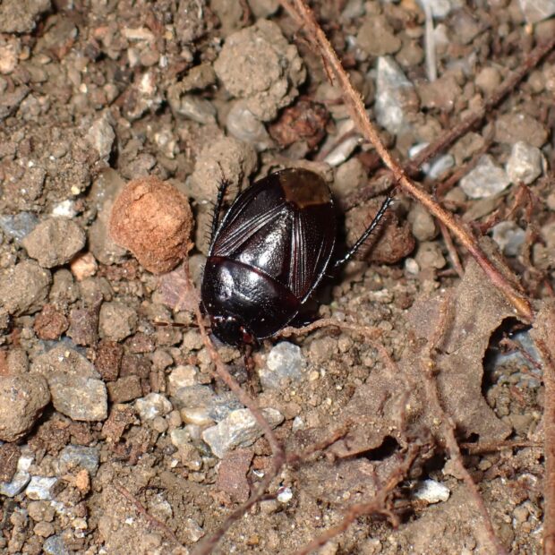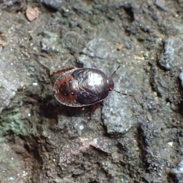 ツチカメムシ科の仲間。 体はだ円形で、 光沢のある黒色(まれに褐色)をしており、 膜質部は茶色。 公園などで、 普通に見られます。 地面を歩き回り、 ヤツデやクスノキなどの実の汁を吸います。