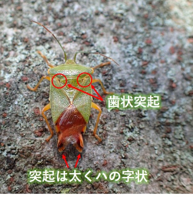 ツノカメムシ科の仲間。 オスの腹端に太い「ハ」の字状の突起があります。 メスには突起がありません。 前胸背の後側縁に歯状突起があるのが特徴。