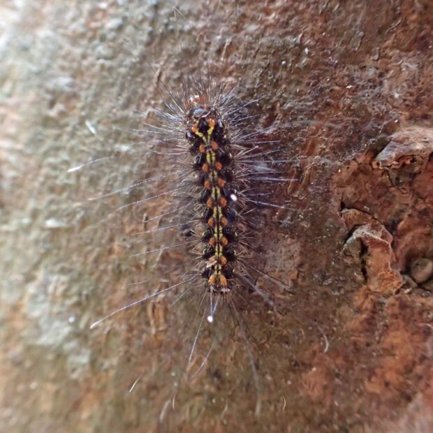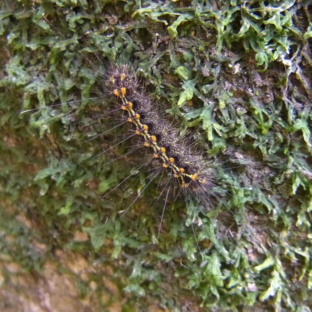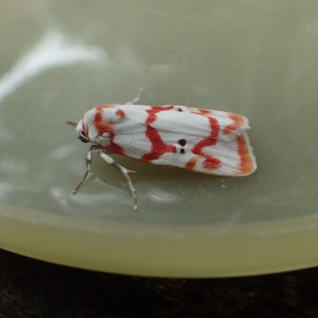 ヒトリガ科コケガの仲間。 白いはねに赤い帯と黒い紋がある美しいガ。 幼虫は地衣類やコケのついた木の幹で見られ、 驚くと落下し動かなくなります。