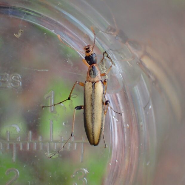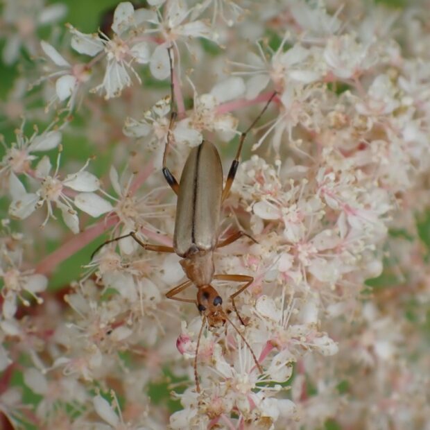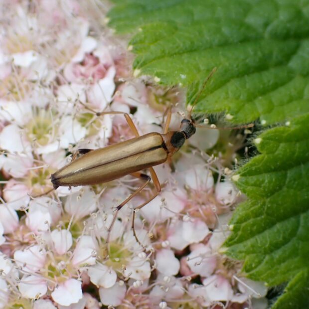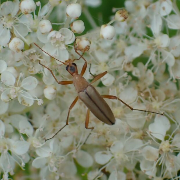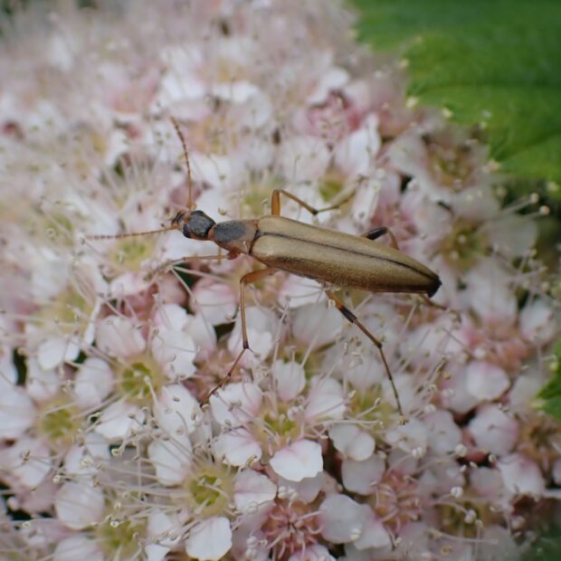 クビナガムシ科の仲間。 夏、 山で咲く花に集まります。 体色や模様は変化があり、 全体が黄褐色のものから黒っぽいものまで変異がみられます。