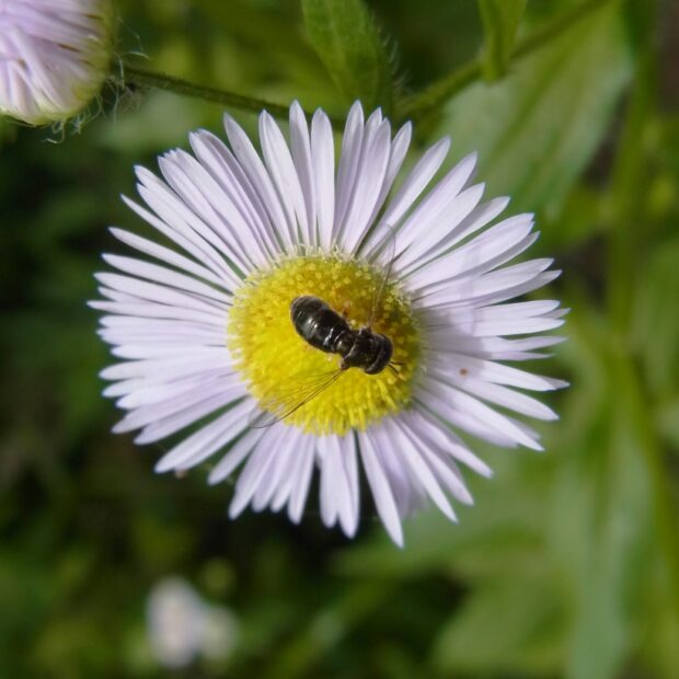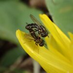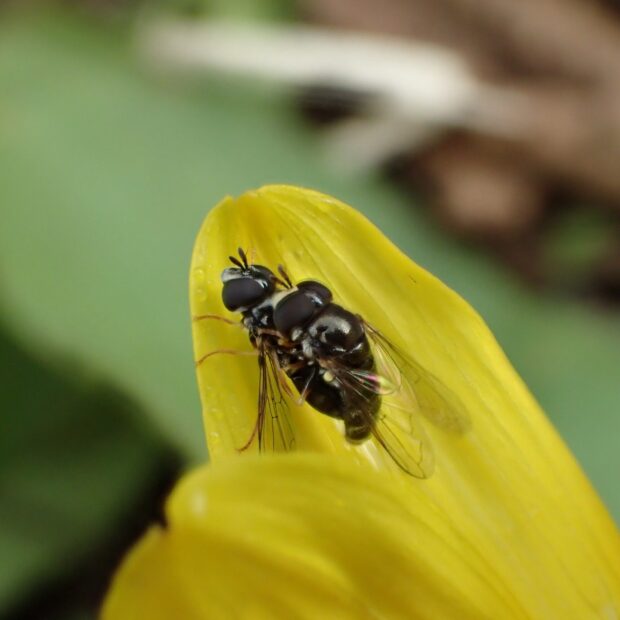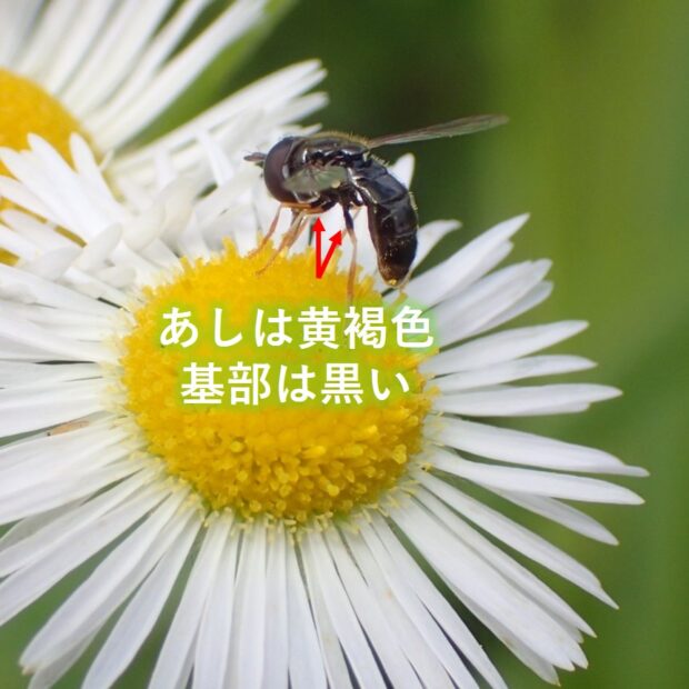 5mm程度の小さなハナアブ。 街中の公園などで普通に見られ、 よく花にやって来ます。 あしが黄色いことから「キアシ」と名づけられました。 胸部と腹部は黒色ですが、 腹部の色は変異があり、 似た種がいます。