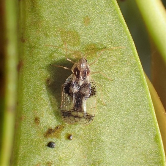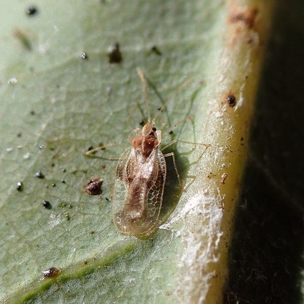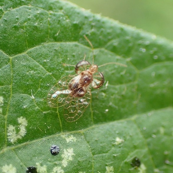 葉の汁を吸うカメムシの仲間。 はねが軍配のように張り出しているので「グンバイムシ」。 小さいながら、 形がおもしろく、 はねはレース模様。 白くなっている葉の裏を探すと見つかることがあります。 日本では70種程度が知られています。 (MT)