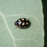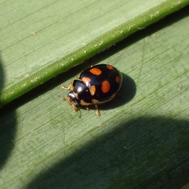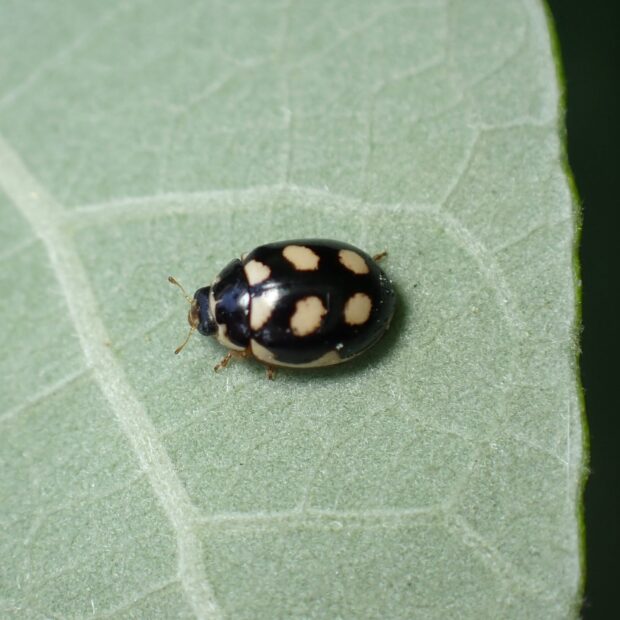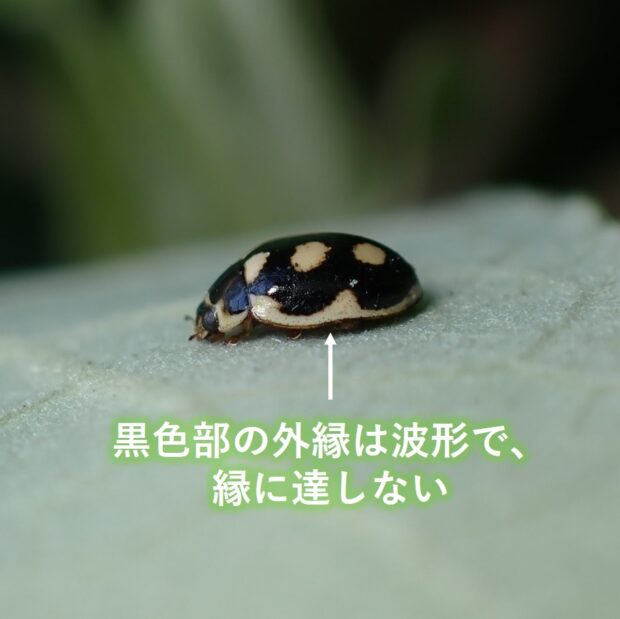 マツ類で見られる小さなテントウムシ。 黄色の3対(6個)の紋があります。 ウスキホシテントウに似ていますが、 本種は、 黄色の紋が大きく、 外縁の模様が波形になっています。