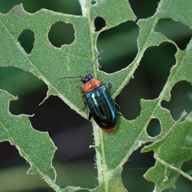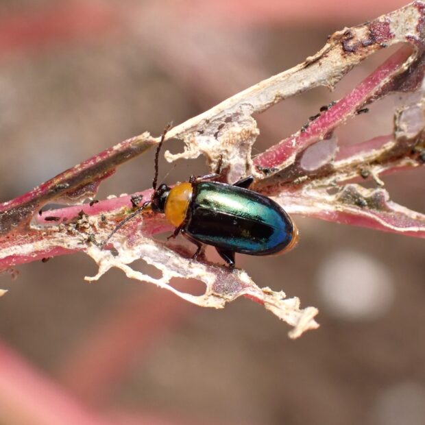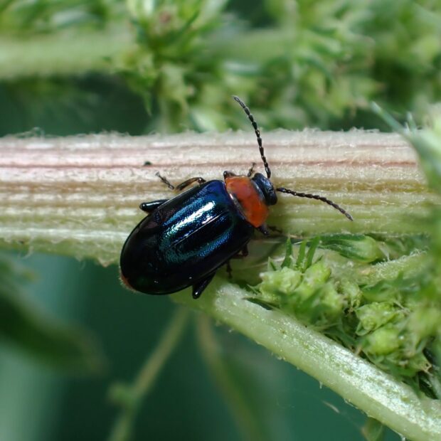 アオビユなどヒユ科植物を食べるハムシ。 体型は楕円形、 前胸背板はだいだい色~朱色で、 上翅は光沢のある藍色。 2020年に発見されたアメリカ原産の外来種です。