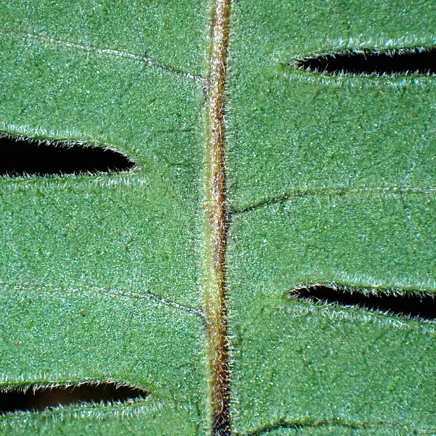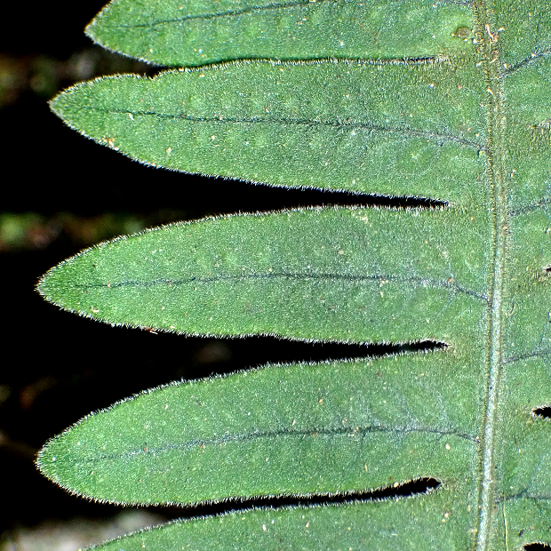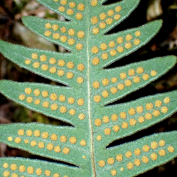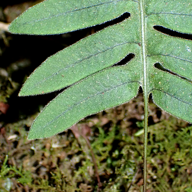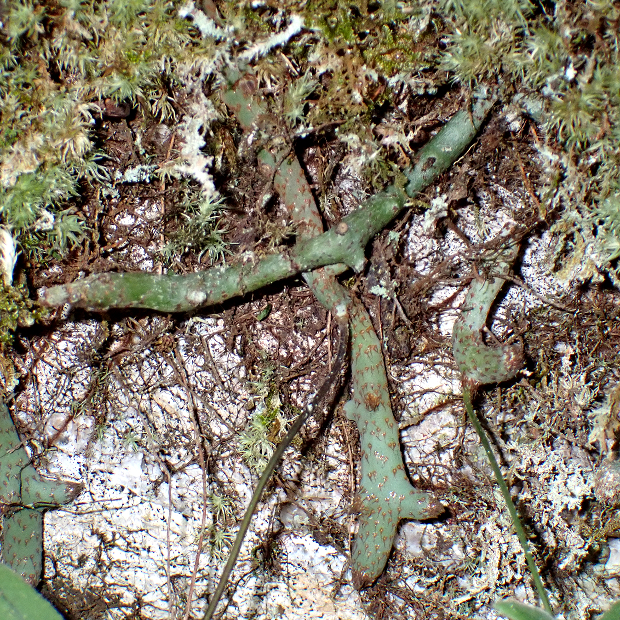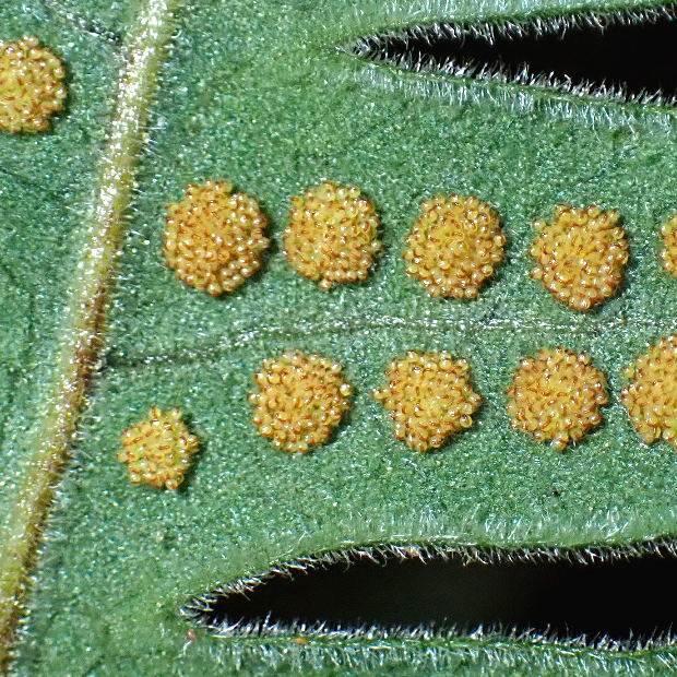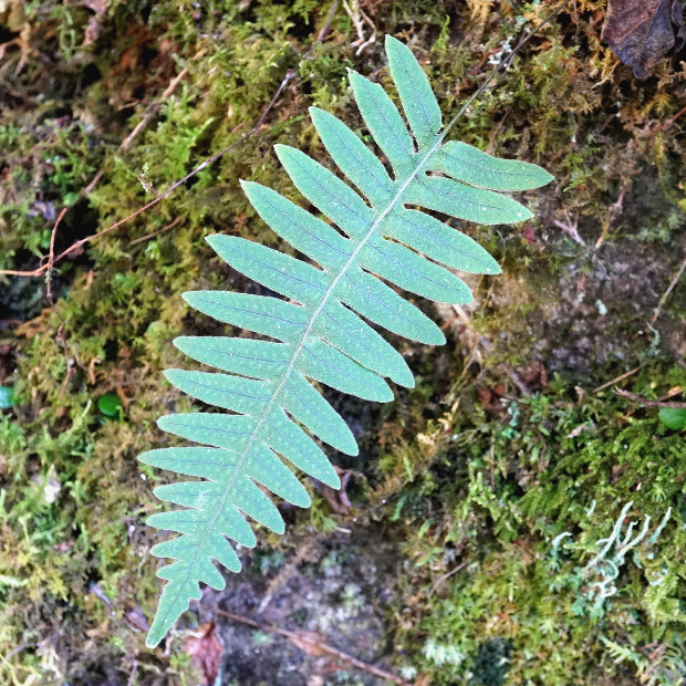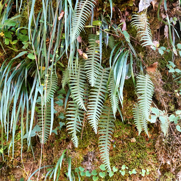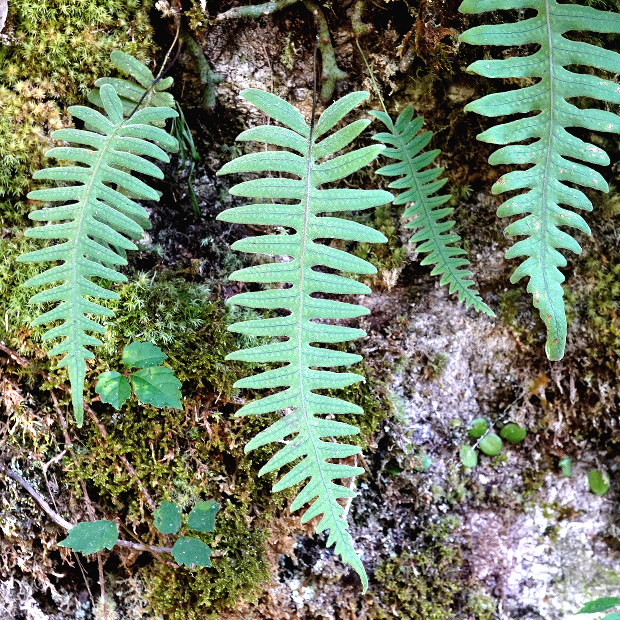 暖かい地域に多いシダで、 つる植物のように岩や幹をよじ登ります。 葉は青白っぽさがあってU字に深く切れ込み、 全体短毛がびっしりでフサフサします。 根茎は青緑色で目立ち、 青根の由来になっています。 夏に葉を枯らし、 秋に葉を出すサイクルをもちます。