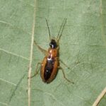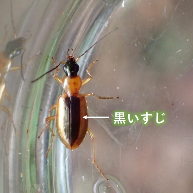 オサムシ科ヒラタゴミムシの仲間。 水田、 河川敷などで見られます。 上翅に特徴的な黒い筋があることが名前の由来です。 明かりに飛来します。