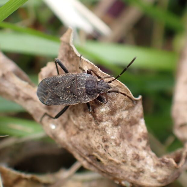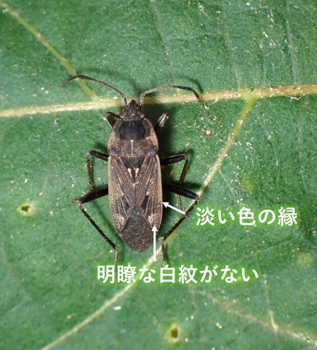 ヒョウタンナガカメムシ科の仲間。 草はらで見られます。 前ばねは黒褐色で、 ふちは淡い色をしています。 皮質部の先端近くに明瞭な白色の紋はありません(似ているアムールシロヘリナガカメムシは明瞭な白紋がある)。