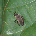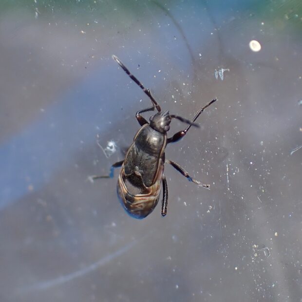 白いへりがある黒っぽいカメムシ