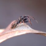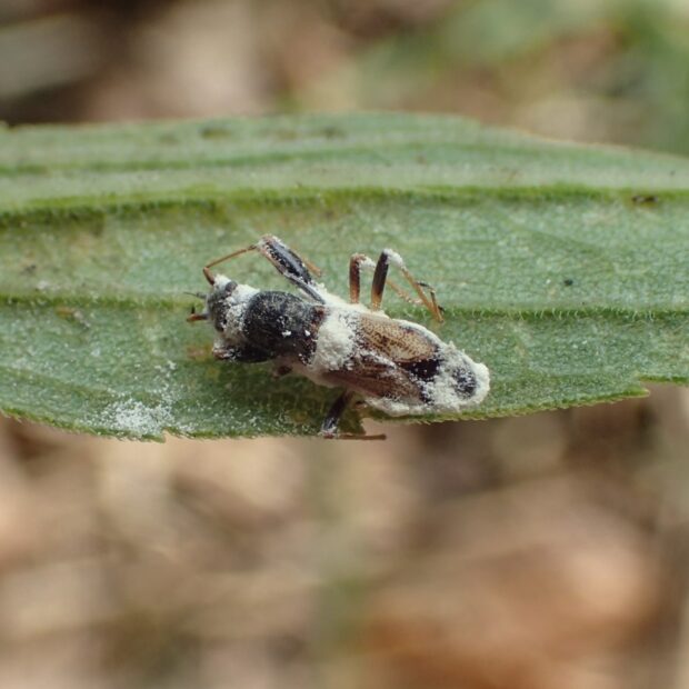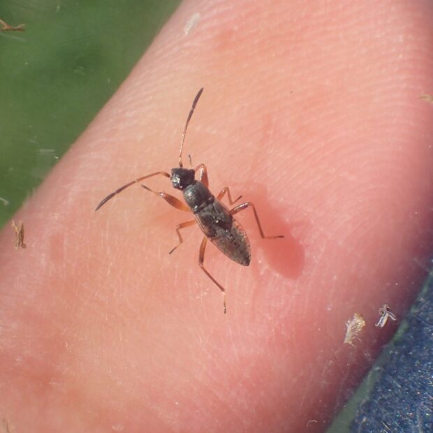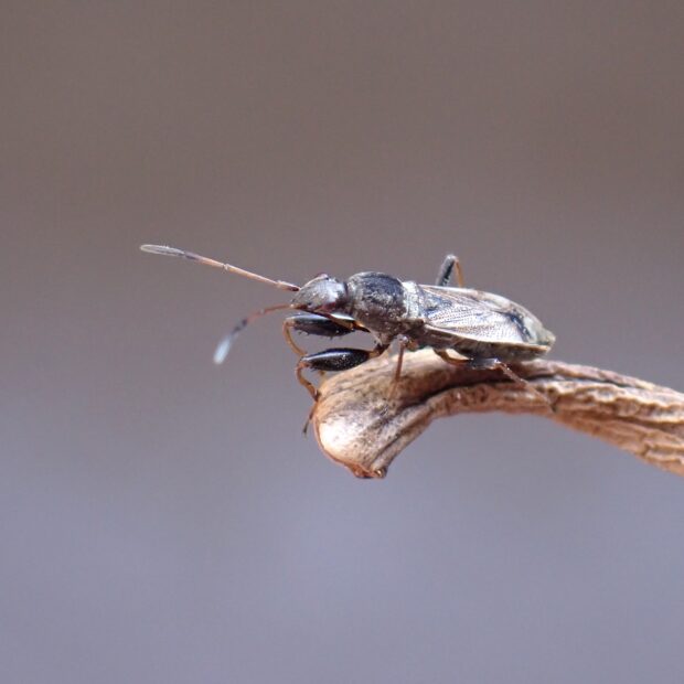 ヒョウタンナガカメムシ科の仲間。 草はらなどで、 イネ科植物の穂や地表で普通に見られます。 ヒョウタンのような姿をしており、 前ばねが短く腹端に達しません(短翅型)。 まれにはねが長い長翅型も見られます。