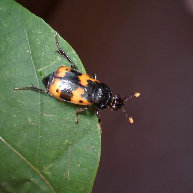 シデムシ科モンシデムシの仲間。 黒い体に4つのオレンジ色の紋があり、 その紋の中に黒点があります。 動物の死骸に集まります。
