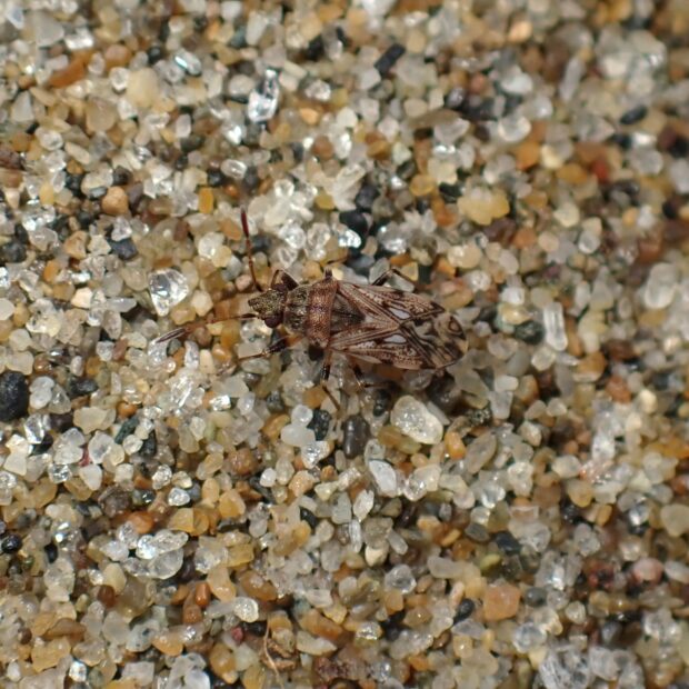 ヒョウタンナガカメムシ科の仲間。 海岸~山。 砂浜や草地で普通に見られます。 チビナガカメムシに似ていますが、 本種は触角第1節が黒いです。