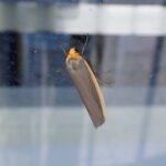 ヒトリガ科コケガの仲間。 前ばねはグレーで前縁が黄色。 頭部が黄色であることが特徴。 体型はほっそりしており、 はねを立てて止まります。