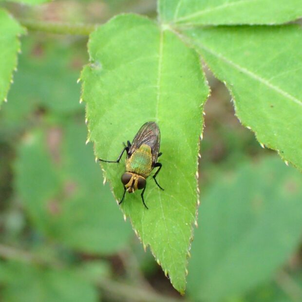 クロバエ科の仲間。 旧名ミドリバエ。 胸は緑色で長い毛がたくさん生えています。 はねは黒っぽく、 花によくやって来ます。
