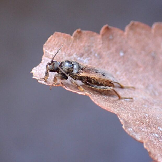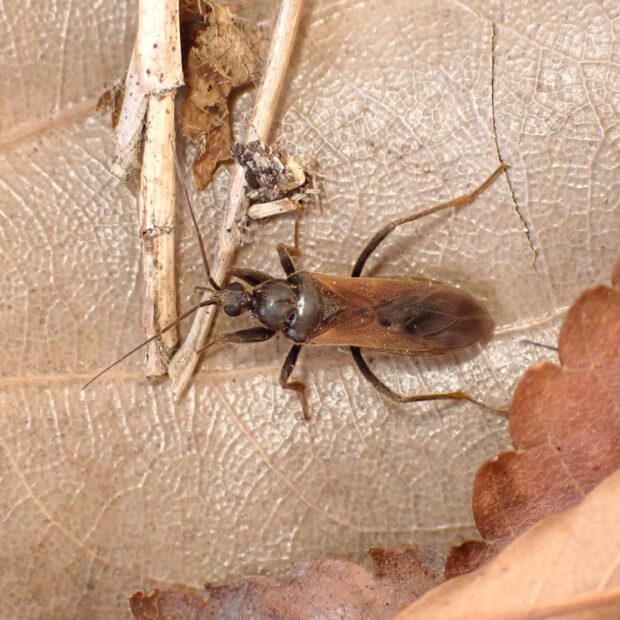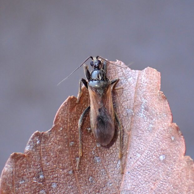 サシガメ科の仲間。 体は黒く、 金色の微毛が生えており、 前ばねは褐色。 地面を歩き回り、 小さな虫を捕え、 針のような口を獲物に刺して体液を吸います。 クロモンサシガメに似ていますが、 本種の方が小さく、 前ばねに大きな紋がありません。
