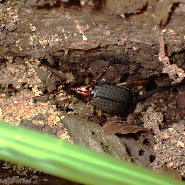 オサムシ科アオゴミムシの仲間。 大型。 頭と胸は金属光沢のある赤銅~緑色、 上翅(じょうし)はつやのない黒色で縦すじが目立ちます。 草地などで普通に見られます。 昼間は石の下などに隠れており、 夜になると、 エサを求めて歩き回ります。