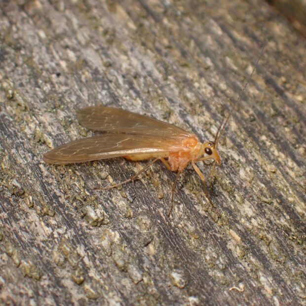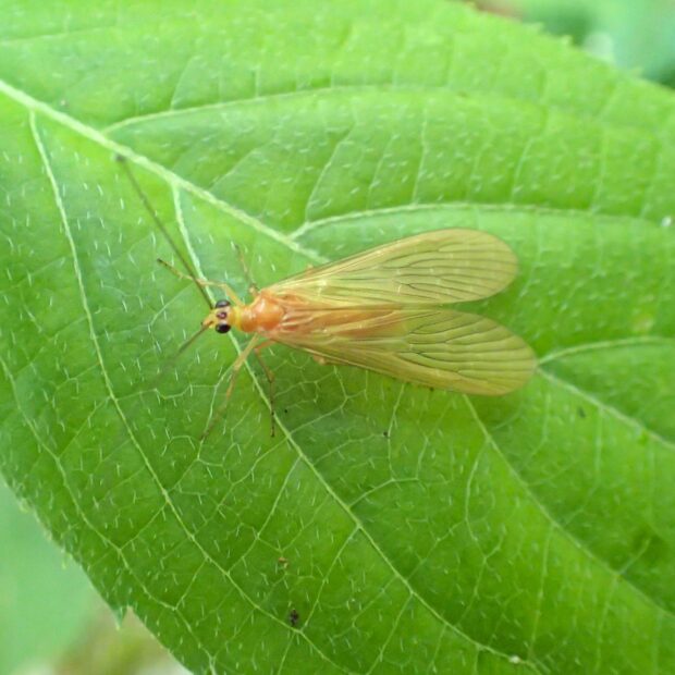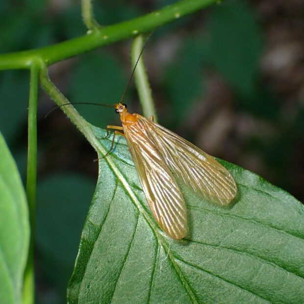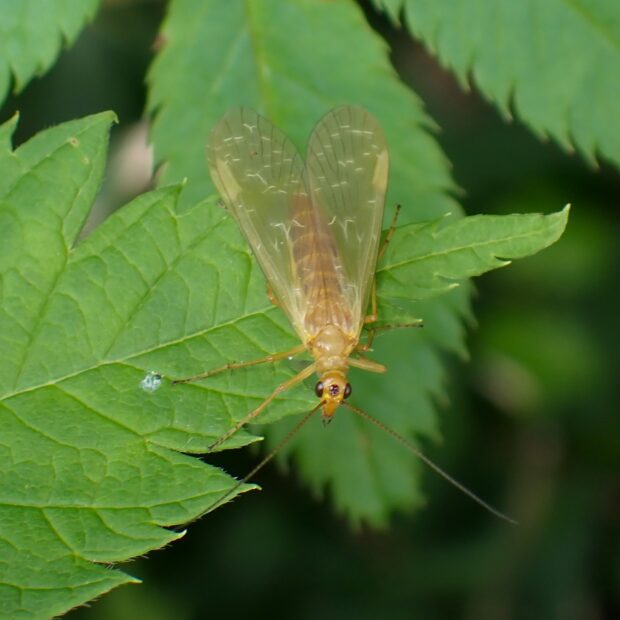 シリアゲモドキ科の仲間。 山の渓流沿いや林縁の湿った場所で見られます。 オスは黄褐色の半透明のはねを持ち、 紋はありません。 メスは3つの型があり、 はねに紋がないもの、 はねの先端に紋があるもの、 はね全体に紋があるものが知られています。