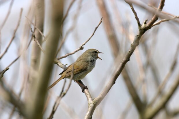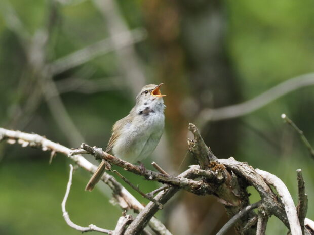 春、 オスは「ホーホケキョ」ときれいな声でさえずります。 「春告鳥(はるつげどり)」とよばれ、 春の訪れを知らせてくれます。 秋冬には「チャッチャッ」と目立たない声で鳴きます。 オスもメスもうすい茶色。 ささ、 やぶなどで、 主に虫をとって食べます。